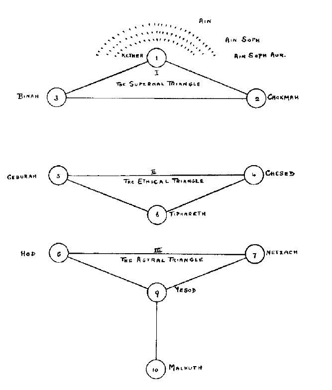 Illustration no.1 from book, the three pillars and the Sephira, showing the descent (the lightning flash) and the manifestation into being.