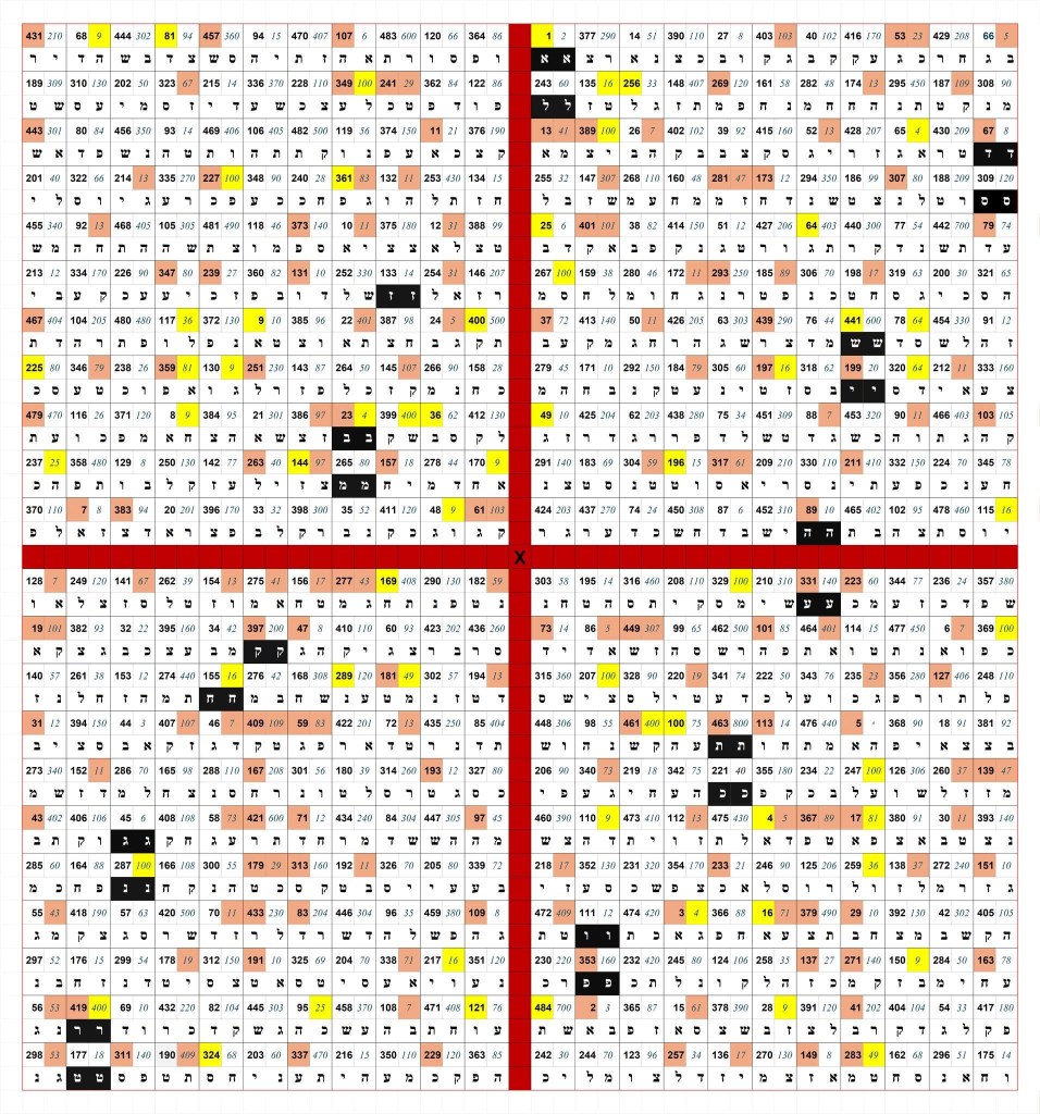 The 22×22 square, as created on Excel, The pink highlighted squares are prime numbers, the yellow are thsoe squared possible. In black are the pairs of Hebrew letters that are the same. The left hand numbers above these are the pairs sequence i.e.e A,A =1 A,B = 2 and the right jhand letter the hebrew gematria. Each line vertical or horizontal or diagonal adds up to the same .