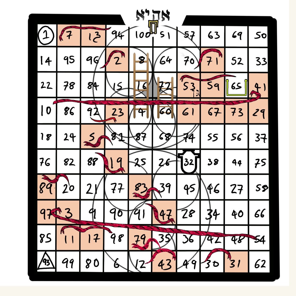 “No” he said, ” but your next art folly will be an 8×8 square ala Mercurius, for Thoth, 32 squares and snakes and ladders.Or chess.”