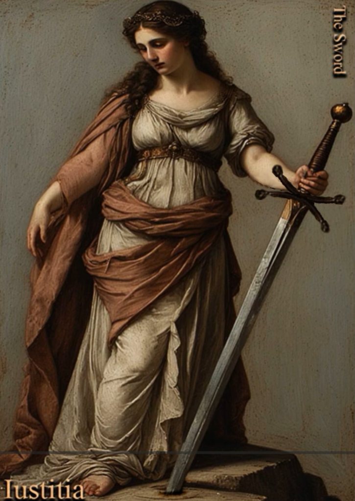 The Sword represents balance, it is why it is held aloft in the scales of Justice (Justitia). It is both severity and mercy. The decision to forgive or curse, pity or scorn. These decisions are made by the heart- the stone, it cannot be questioned. How the sword is used is governed by Wisdom. The holder of the sword acts in wisdoms sake. We are given the facts of our austerity, the pros and cons, the blocks and open doors and thus we understand our situation, but it is wisdom to guide us.